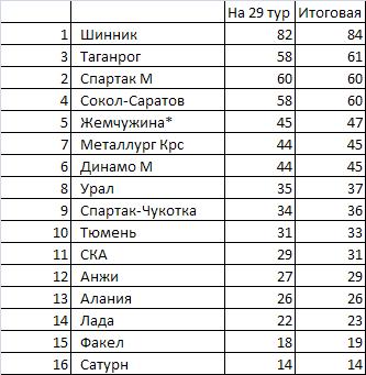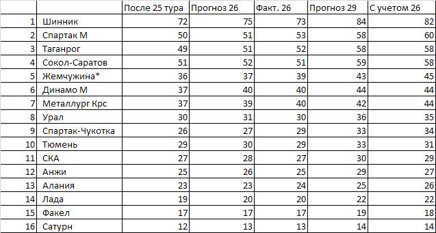 Итак, где же эта таблица???! Вот она, вуаля: Теперь о ней поподробней. Пролистываем информативные колонки: № п/п, название команды и данные после 25-го тура. Первая расчетная колонка (прогноз 26) показывает каковым очковым запасом клубы должны были бы обладать исходя из представленных прогнозов на 26 тур, следующая (факт 26) – реальное положение вещей на текущий момент, (прогноз 29) - данные с учетом прогнозов на четыре тура, и последняя расчетная колонка (с учетом 26) – прогноз на четыре тура вперед скорректированный на разницу между предсказанными и реальными результатами 26-го тура. Таким образом, можно сделать следующие выводы. Благодаря победе над Соколом, Спартак М перед последним заключительным туром будет иметь некоторое преимущество над двумя остальными конкурентами на серебро. Так как вероятность того, что в интеррейтингах Россию сдвинут на 4-ое место очень высока (Норвегии достаточно заработать всего одну ничью), то желанную путевку в КК будут разыгрывать три команды: Жемчужина, Динамо М и Металлург Крс, причем их позиции в этой борьбе можно назвать приблизительно равными. Урал окончательно останется без евро, как не попадет туда и Спартак Чукотка (если конечно Россия не сохранит каким-то чудом 3-е место в интеррейтингах). Факел и Сатурн – досрочно лишатся права выступать в сильнейшем дивизионе России на следующий год. Предположим что так оно и будет, что тогда случится в 30-м туре: Рассмотрим матчи по порядку: Таганрог – Сатурн 90 -10- 0 Вероятность даже ничьей для гостей будет практически нулевой, беречь состав будет уже не надо, а на текущий момент южане обладают гораздо более сильным составом с хорошей моралью и формой. Так что имеет смысл оставить только процентов 10 на «чудо». Спартак Чукотка – Металлург Крс 20-60-20 Наиболее запутанная ситуация будет с претендентами на КК. Больше чем уверен, что мы увидим и «поддавки» (хотя в этом матче они и менее вероятны), да и Чукотка достаточно сильный соперник, которого и с более сильной мотивацией сложновато обыграть у него дома. Думаю, что матч сведется к ничьей, вероятность победы каждого из противников приблизительно равная. Лада – СКА 25-45-30 СКА будет иметь реальную возможность избежать переходных игр и постарается ее использовать, проблема в том, что команды не обладают достаточным атакующим потенциалом и напротив обладают достаточно сильной вратарской линией, на стороне Лады один плюс – игра дома, на стороне гостей два – у них и моралька будет получше и поуверенней они выглядят в этом сезоне, поэтому ставлю на минимальное преимущество гостей, хотя наиболее вероятным исходом является все же ничья. Тюмень - Анжи 35-45-20 Тоже приблизительно равные соперники, разница только в том, что тут поувереннее выглядят хозяева, а Анжи уж очень плохо выступает на выезде, думаю в этом матче дагестанцы поймут, что переходных матчей не избежать. Сокол Саратов - Алания 80-20-0 Алания уже неоднократно показывала свое умение играть на ничью, вот и Шинник в прошедшем туре пал ее жертвой, но тут слишком много будет на кону, и, думаю, что хозяева все-таки добьются успеха. Жемчужина – Факел 70 -20 -10 Бесспорно, сочинцы тоже бы хотели отправиться вместо кубка WIFA в легкую прогулку по кубку Кубков, но уж очень явным будет проигрыш в данном матче, да и Жемчужина, по сути, вполне созрела для кубка WIFA, так что думаю Стеф победит. Ш