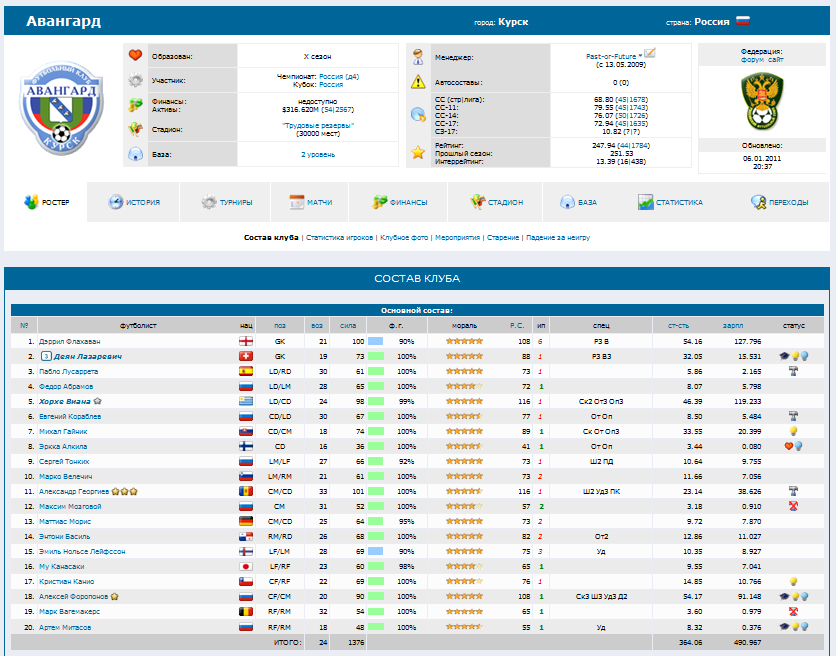 Собственно и больших провалов то у клуба не было, и развивался он поступательно, но… уж слишком медленно. Отправной точкой нынешней неудачи я бы считал создание Авангарда, точнее его неграмотное создание. Насколько я помню, Авангард входил в число клубов, где, несмотря на все «акции и плакаты», все изначально было сделано через.… Даже более того, все пошло наперекосяк еще до того как. Первый менеджер, который взялся руководить данным клубом (fenixprog), исчез, не распределив ни силу, ни возраст, ну и естественно не сыграв ни одного матча. Так как на календаре был уже последний день для формирования новых команд – приходилось спешить, поэтому ликбез был проведен, по сути, с первым встречным, изъявившим желание руководить российским клубом, но видимо из-за скомканности VZ, так назывался новый менеджер, не всю информацию «впитал». В результате после десяти туров клуб вновь оказался в свободных. Чего и следовало ожидать, сумев одержать, лишь 2 победы в десяти матчах тренер бросился «в бега».