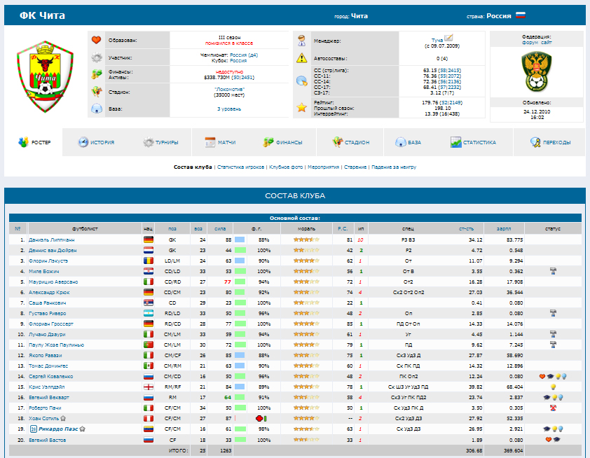 Знал бы кто-нибудь тогда, к чему приведет данное назначение, но,… увы. А далее все было достаточно плачевно. Казалось бы, Voldo тоже не был новичком, до этого он рулил Салютом-Энергией, однако позже выяснилось, что я как руководитель Федерации упустил из виду некоторые трансферные сделки Салюта, которые характеризовали данного менеджера крайне негативно. Сделки Вольдо проводить очень любил, но не умел. Этим, кстати, отличается и его более поздняя трансферная политика, к счастью уже вдалеке от российских берегов. Вот и на посту менеджера Локомотива он сумел с помощью трансферных операций за два сезона превратить команду из лидера третьего дивизиона в ее аутсайдера, как по силе, так и по активам. Впрочем, для данного менеджера апогеем стало пребывание (недолгое) на посту менеджера Амкара, увольнение и последующее изгнание уже и из турецкого клуба, куда он пришел на закате своей карьеры. Ну а в Локомотиве он отметился соответственно: 4,6 и 7 местами в 13-15 сезонах соответственно.