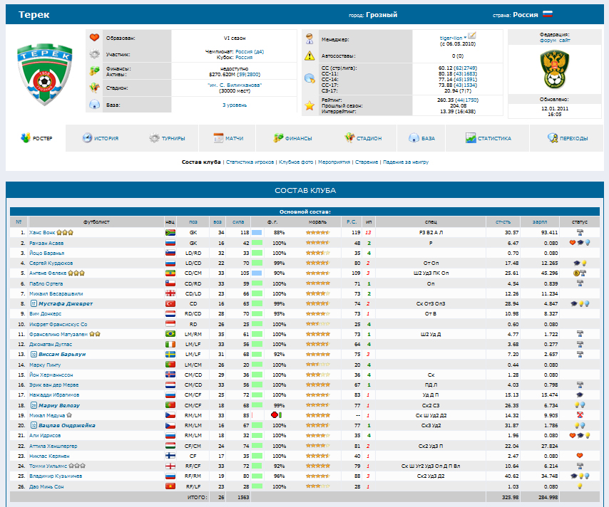 Итак, в середине предпоследнего в своей истории 17-го сезона клуб вновь оказывается в свободных, и надо сказать идет в чемпионате далеко не на первом месте. Это естественно не прибавляет желающих его возглавить. В результате Терек получает нынешний менеджер – tiger-lion. Причем, нельзя сказать, что он хотел возглавить именно его, просто взять он хотел клуб вторым, чтобы сохранить имеющийся у него американский клуб, а на то, чтобы выдать более сильный клуб вторым, не согласилось уже руководство Федерации. Вот так вот все совпало, и нынешний менеджер Терека (который, насколько мне известно, уже подал заявку на смену второго клуба) оказался перед лицом мобилизовать все силы для сохранения прописки в российском первенстве, но, несмотря на все приложенные усилия (а надо отдать этому менеджеру должное, он не сидел, сложа руки, наблюдая за тем, как Терек перестанет существовать) – случилось то, что случилось. В данном случае, думаю, немного не хватило и начальной базы, и опыта борьбы при столь жесткой конкуренции, хотя у тренера, естественно, другое мнение. Он склонен винить в итоговом результате основного кипера команды, который был, по его мнению, не настолько хорош…