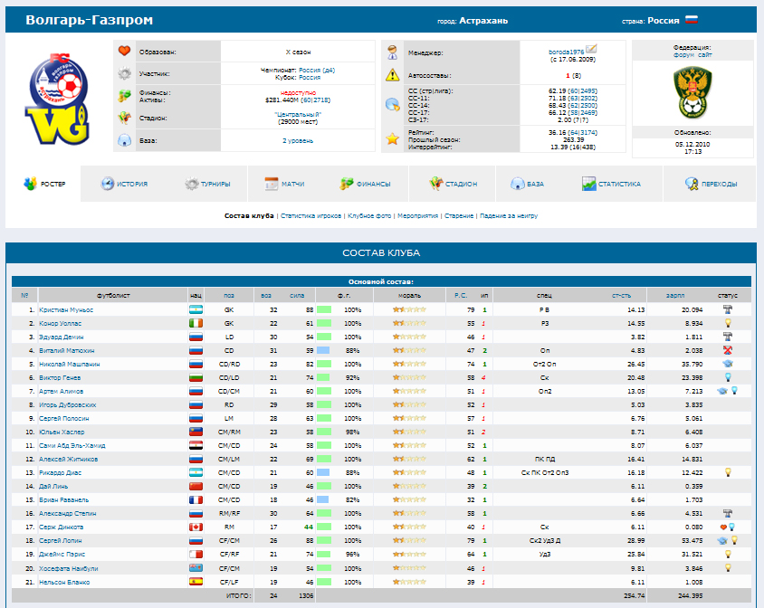 Итак, начнем. У истоков команды стоял менеджер rembo587. Сейчас сложно вспомнить, но мне кажется, и тут с регистрацией новой команды было не все гладко. Вообще следует отметить, что первоначальное распределение базовых параметров имеет колоссальное значение. Но случилось, как случилось, и команда сразу «забуксовала». На тот момент жестких критериев по смене клуба не существовало, а потому менеджер, почувствовав, что дело «пахнет жареным», попросту слинял, воспользовавшись дефицитом желающих в более сильный клуб – Металлург-Кузбасс. Но как это часто бывает и там тоже оказался «не мёд» и в результате за три автосостава данный менеджер был изгнан и более уже не появлялся в поле видимости. За свое пребывание в Волгаре он успел провести 19 матчей, из которых только один сумел выиграть. Не густо скажете вы – и будете абсолютно правы.